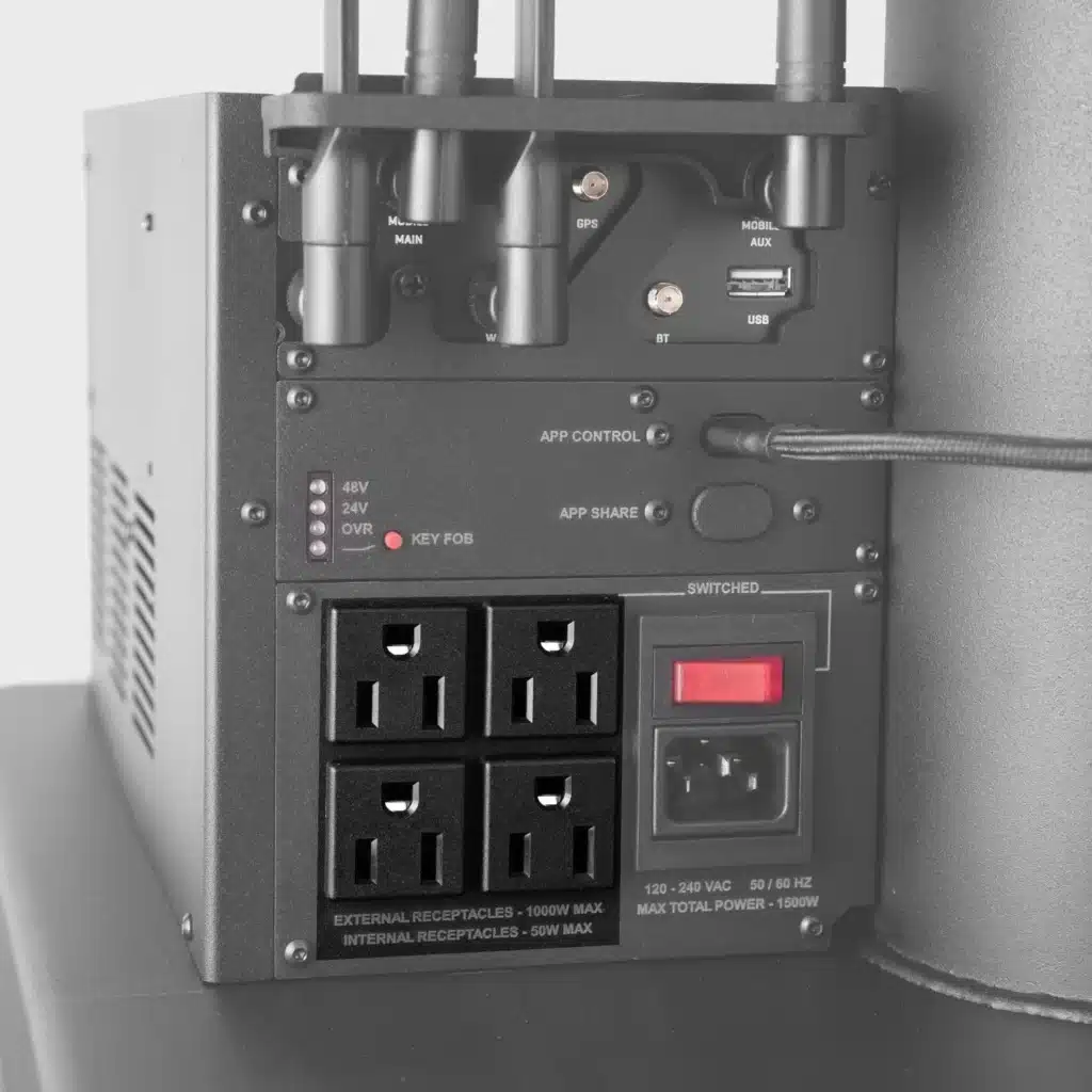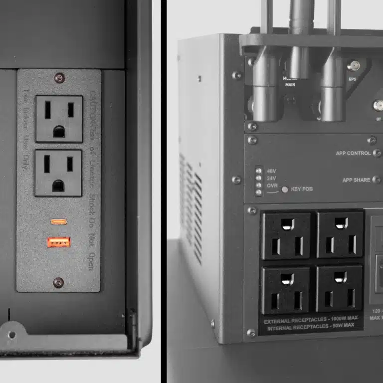 Adds power for external accessories such as lights as well internal AC and USB power for phones and small components. Includes: