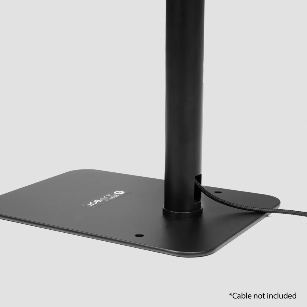 Adjustable height tablet stand with internal cable routing.