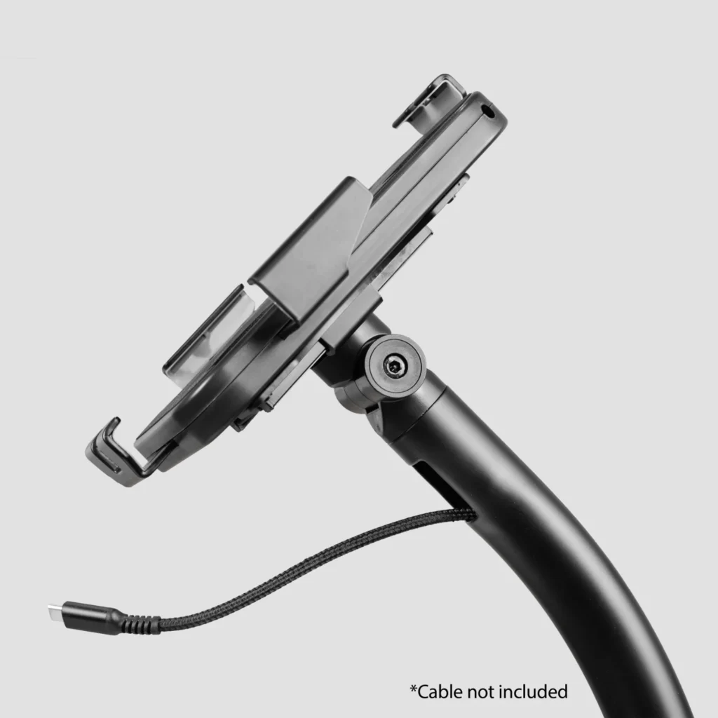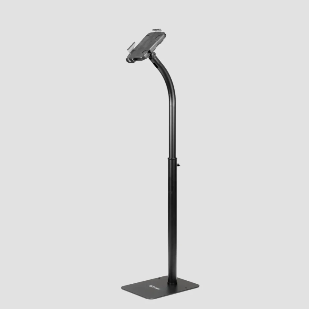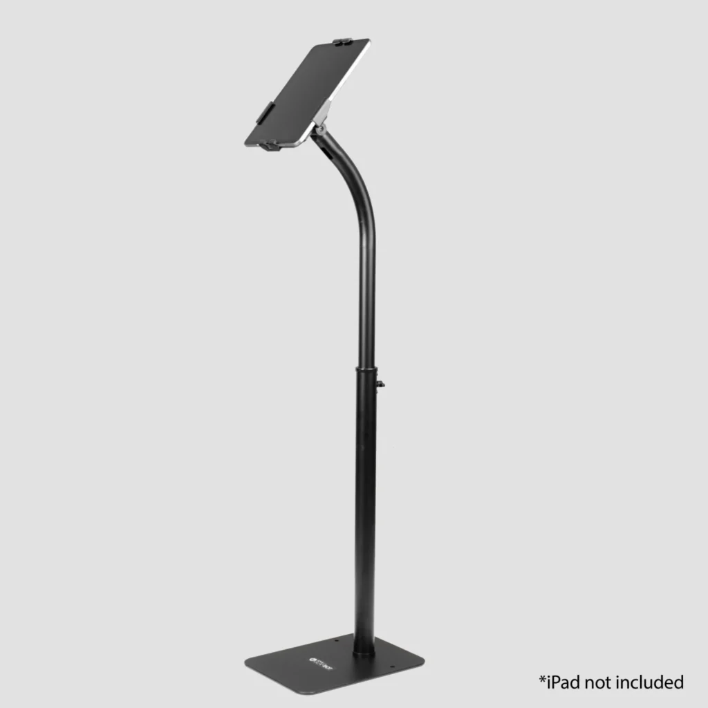 The pole is height adjustable between 31.1″ (79 cm) and 46.85″ (119 cm). The fully adjustable head can tilt and rotate; it features adjustable clamps to fit different tablet sizes from 7.9″ (20 cm) to 11″ (27 cm). Please measure your tablet to ensure compatibility before purchase.
